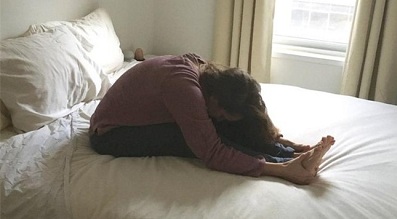 Cho 2 chân xuống khỏi giường, chạm vào sàn nhà. Giữ đầu gối uống cong, cúi đầu và kéo 2 tay xuống sát sàn để khu vực vùng lưng sát đầu gối. Để đầu và cánh tay buông xuống sàn nhà rồi quay trở lại áp sát đầu gối.