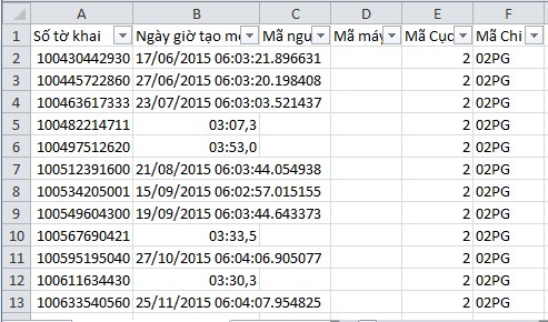 100512391600 ngày 21/08; 100534205001 ngày 15/09; 100549604300, 100567690421 ngày 19/09; 100595195040, 100611634430 ngày 27/10; 100633540560 ngày 25/11.