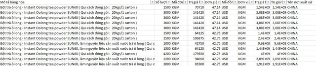Tổng cộng, trong 6 tháng cuối năm 2015, Suntory Pepsico Việt Nam đã nhập từ Trung Quốc về Việt Nam 30.672kg bột trà ô long - Instant Oolong tea powder SUN60.