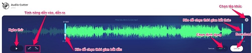 Bước 3: Thực hiện kéo 2 thanh ở 2 đầu để chọn thời gian bắt đầu và kết thúc của đoạn nhạc mong muốn. Tính năng dẫn vào, dẫn ra giúp âm thanh bắt đầu và kết thúc mượt mà hơn (lớn dần, nhỏ dần), không bắt đầu hoặc dừng đột ngột. Nhấn nút Play (hoặc nút Space – dấu cách) để nghe thử đoạn nhạc vừa tạo.