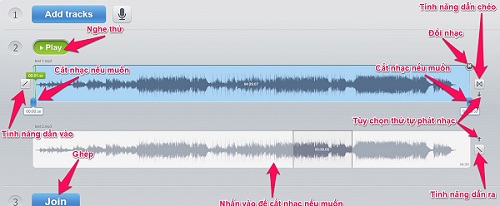 Bước 3: Sau khi thêm các bản nhạc cần ghép, bạn sẽ thấy các công cụ như hình dưới. Nhấn vào các bản nhạc để tùy chỉnh theo ý bạn. Trong đó: