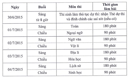 Để thống nhất thực hiện lịch thi THPT quốc gia năm 2015, Cục Khảo thí và Kiểm định chất lượng giáo dục đã có công văn gửi các cơ sở giáo dục đại học, các sở giáo dục và đào tạo tổ chức kỳ thi trung học phổ thông quốc gia thời gian làm thủ tục dự thi và thời gian làm bài thi; thời gian biểu từng buổi thi các môn tự luận và các môn trắc nghiệm.