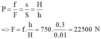 Bài 2: Trong một máy ép dùng chất lỏng, mỗi lần pit – tông nhỏ đi xuống một đoạn 0,3 m thì pit – tông lớn được nâng lên một đoạn 0,01 m. Tính lực tác dụng lên vật đặt trên pit – tông lớn nếu tác dụng vào pit – tông nhỏ một lực f = 750 N.