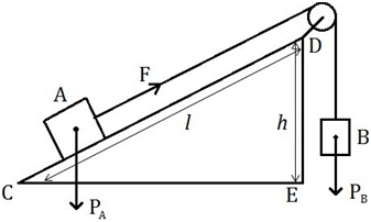 Bài 8: Người ta dùng vật B kéo vật A (có khối lượng mA = 10 kg) chuyển động đều đi trên mặt phẳng nghiêng như hình bên. Biết CD = 4 m, DE = 1m. Bỏ qua ma sát, vật B phải có khối lượng bao nhiêu?