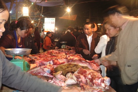 Ngoài ra còn có thứ thực phẩm được người bán kẻ mua rất tưng bừng náo nhiệt. Ðó là thịt bò non. Nói đúng ra là thịt bê được thui vàng ươm nguyên cả con, bán rất nhiều dọc các ngả đường đi vào chợ. Có thể nói không ngoa rằng "Trên là trời, dưới là thịt bò bê". khách mua ai thích phần nào có thể tuỳ chọn, mà giá lại rất phải chăng, hợp với túi tiền của "người nhà quê".