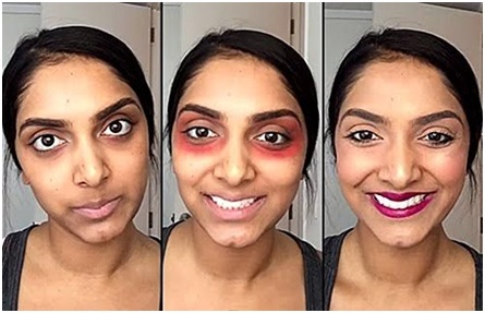 Cách làm của Deepica Mutyala không có gì phức tạp. Sau khi hoàn thiện bước nền, cô sử dụng một thỏi son đỏ và chổi để tô lên vùng da sậm màu cần khắc phục như quầng thâm mắt, rồi tiếp tục dùng kem che khuyết điểm dạng lỏng phủ lên trên, tán đều lớp kem và làm cho quầng thâm biến mất ngoạn mục.