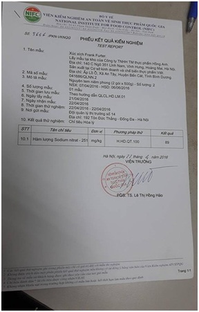 Qua đó, bốn mẫu xúc xích của Vietfoods đã được đội Quản lý thị trường số 14 mang đi kiểm nghiệm tại Viện Kiểm nghiệm Vệ sinh an toàn Thực phẩm Quốc gia. Kết quả, các mẫu mang đi kiểm nghiệm đều chứa chất cấm Sodium nitrate 251 (còn được gọi là chất ổn định màu), một chất mà Bộ Y tế đã cấm dùng trong thực phẩm vì gây ra biến đổi chất trong quá trình chiên, rán ở nhiệt độ cao và là nguyên nhân gây ra căn bệnh ung thư cho hàng triệu người trên thế giới.
