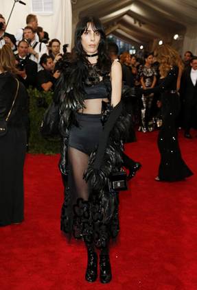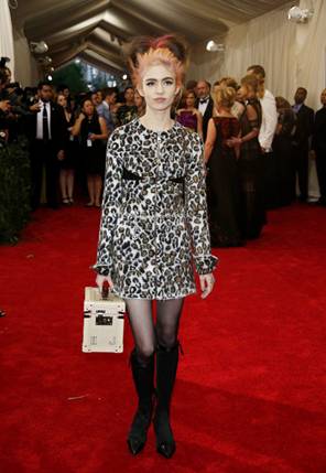 Nhìn giọng ca người Canada Grimes chắc chắn nhiều người sẽ liên tưởng tới hình ảnh một chuyên viên make-up khi xuất hiện trên thảm đỏ với váy ngắn xuề xòa kèm bốt cổ cao kém sang, mix túi cầm tay giống hệt chiếc hộp đựng đồ trang điểm.