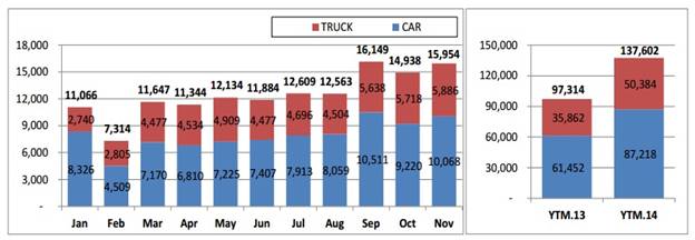 Tính riêng trong tháng 11, doanh số toàn ngành đạt 15.954 xe, bao gồm 10.068 xe con và 5.886 xe tải, lần lượt tăng 9% và 3% so với tháng 10. Sản lượng xe lắp ráp trong nước đạt 11.591 xe còn số lượng xe nhập khẩu đạt 4.363 đơn vị.