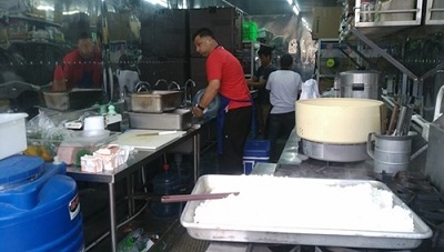 Bếp nấu ăn được đặt trên một chiếc container, có cả món Tây và món Việt.