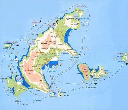 Bản đồ du lịch Côn Đảo với các đường màu đỏ và đường đứt đoạn chỉ dẫn đường đến các địa danh khác nhau vòng quanh đảo. Bạn có thể in tấm bản đồ Côn Đảo này và mang theo trong chuyến du lịch Côn Đảo để tiện đi lại và thăm thú đây đó tại đảo mà không phải lo sợ lạc đường.