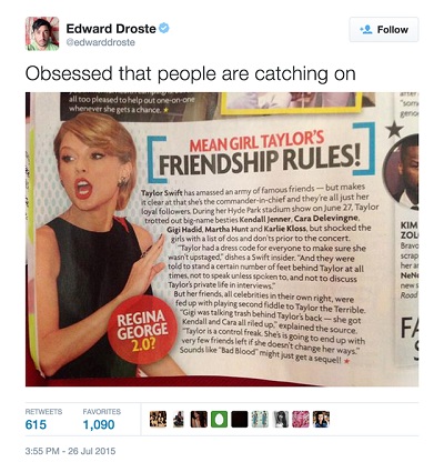 Edward còn đăng lại một bài báo của tạp chí Star (bài vạch trần nhân cách xấu xí của Taylor) và chú thích: "Tôi không thể ngừng nghĩ đến chuyện người ta bắt đầu hiểu ra điều này".