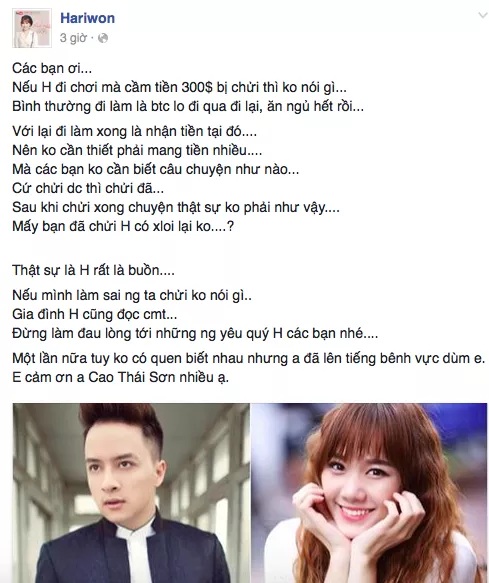Mới đây, Hari Won vừa chia sẻ trên trang cá nhân của mình rằng nếu đi chơi mà mang 300$ trong người thì không nói. Chuyến đi Mỹ lần này Hari đi làm, có BTC lo cho ăn uống đi lại, làm việc xong nhận tiền tại đó nên không nhất thiết phải mang nhiều tiền. Hari khá bức xúc: "Các bạn không biết câu chuyện như thế nào, cứ chửi được thì chửi. Sau khi chửi xong sự thật không như vậy mấy bạn đã chửi Hari có xin lỗi không? Thật sự Hari rất buồn.... Gia đình Hari cũng đọc comment, đừng làm đau lòng những người yêu quý Hari các bạn nhé". Bên cạnh đó, Hari Won còn cảm ơn Cao Thái Sơn vì đã lên tiếng bênh vực mình.