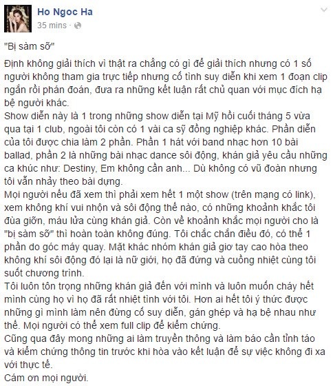 Sau khi thông tin Hồ Ngọc Hà bị fan chạm vào vòng 3 trong lúc trình diễn quá sung tại một sân khấu ở Houston (Mỹ) được lan tỏa, nữ ca sĩ chính thức có phản hồi trên trang cá nhân.