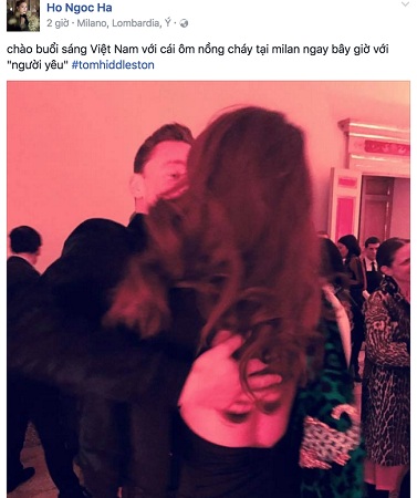 Vừa qua, Hồ Ngọc Hà đã có mặt tại Milan (Italy) để tham gia show diễn thời trang xuân hè 2017 của một thương hiệu đình đám với tư cách VIP. Tại đây, cô có cơ hội gặp gỡ những tên tuổi nổi tiếng hàng đầu thế giới. Đặc biệt, nữ ca sĩ không giấu nổi sự phấn khích khi được diện kiến tài tử Tom Hiddleston.