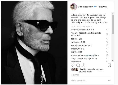 Victoria Beckham đã viết trên trang cá nhân: Thật tồi tệ khi nghe tin này. Karl là 1 thiên tài, luôn rất tuyệt vời và rộng lượng với tôi trong cả cá nhân và công việc. Yên nghỉ nhé.