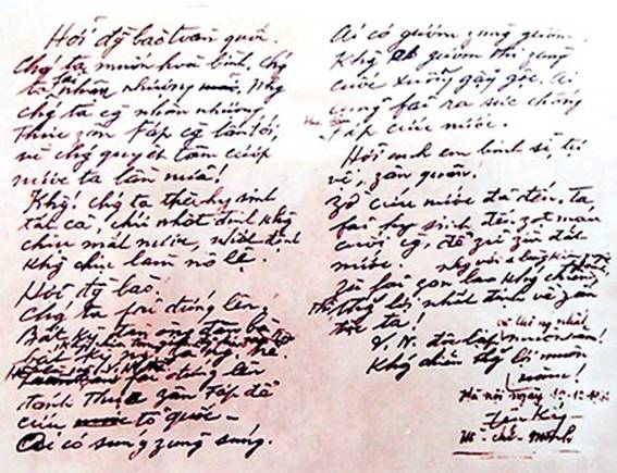 Hỡi đồng bào! Chúng ta phải đứng lên. Bất kỳ đàn ông, đàn bà, bất kỳ ngưới già, người trẻ, không phân biệt tôn giáo, đảng phái, dân tộc, hễ là người Việt thì phải đứng lên chống thực dân Pháp. Ai có súng cầm súng, ai có gươm cầm gươm, không có gươm thì dùng cuốc, thuổng, gậy gộc, ai cũng phải ra sức chống thực dân Pháp cứu nước.