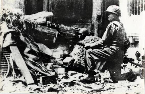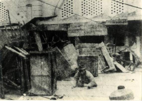 Một chiến sĩ quyết tử quân cố gắng đặt mìn trước cửa chợ Đồng Xuân, Hà Nội.