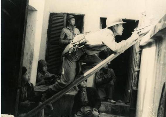 Bộ đội ta vượt tường, tấn công địch ở phố Hàng Đường, Hà Nội.