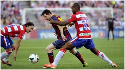 Có thông tin cho rằng, Real đã vung tiền để các cầu thủ Granada (áo sọc) cầm chân Barca