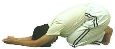 - Thở ra, cong người xuống, hai tay chạm chiếu rồi từ từ đẩy tay về phía trước. - Hai tay luôn thẳng, mũi và trán chạm chiếu, mông luôn luôn phải ngồi trên gót chân.