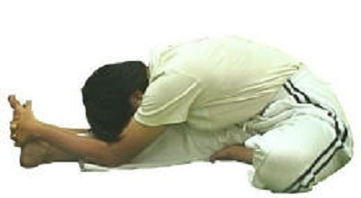- Trán nên chạm được với đầu gối, giữ tư thế này trong 8 giây, nín thở, hít vào khi nâng người lên.