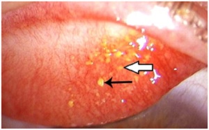 Triệu chứng cơ năng khác là bệnh nhân thấy kết mạc bị viêm, đỏ. Có trường hợp, hạt sạn cứng quá sẽ gây xước giác mạc, kích thích chảy nước mắt nhiều. Khi tới bác sĩ chuyên khoa mắt khám, sẽ thấy các nang chứa dịch nhầy, hoặc có hạt sạn với nhiều kích thước khác nhau, tùy giai đoạn hình thành.