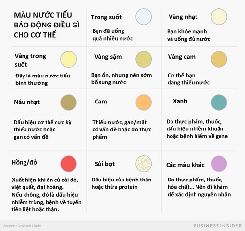 Khi cơ thể tiêu hóa thức ăn và thải độc, chúng ta thải khoáng chất và hóa chất qua nước tiểu. Phụ thuộc vào độ đậm đặc - cho thấy bạn có uống đủ nước hay không, nước tiểu có thể có màu vàng đậm hoặc nhạt. Một số loại thuốc và bệnh có thể khiến dung dịch này đổi màu. Do đó, bạn nên theo dõi màu nước tiểu và tới gặp bác sĩ khi phát hiện thấy màu sắc bất thường lặp lại nhiều lần.