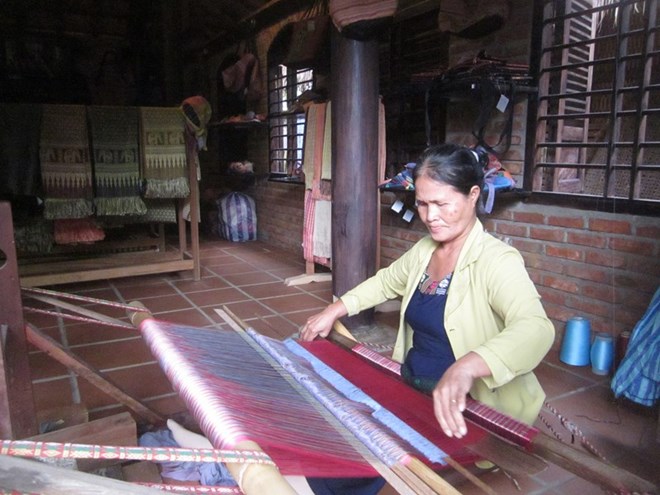 Nghệ nhân dân tộc Chăm trình diễn nghề dệt lụa thủ công.