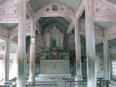 Lối vào nhà thờ từ hướng nam sẽ bắt gặp một hồ nước, có một hòn đảo nhỏ có đặt chúa giê su. Hướng nam là hướng thánh nhân, nam diện, Nhi thịnh thiên hạ có nghĩa là Bậc thánh nhân quay về hướng nam nghe thiên hạ dãi bầy.