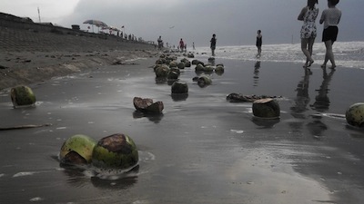 Trên bãi biển Thịnh Long, rất nhiều du khách "tiện tay" vứt vỏ dừa đã uống trên bờ tạo nên khung cảnh không đẹp này.