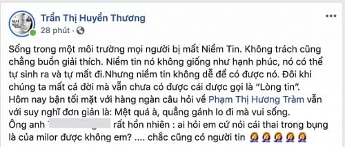 Không chỉ có màn đáp trả cực gắt với tin đồn mang thai mà quản lý truyền thông còn tag cả Hương Tràm vào dòng trạng thái này. Nhiều bình luận ủng hộ cho quản lí truyền thông của Hương Tràm vì thông tin quá vô lí khi bảo Hương Tràm mới có thai một tháng quả khó có dấu hiệu để đặt nghi vấn.
