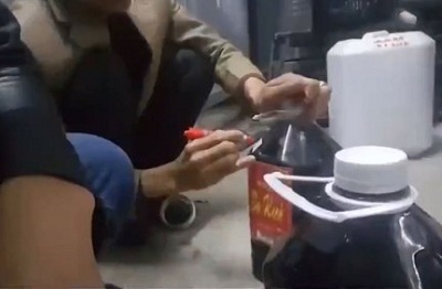 Bước 3: Đổ vào can nhựa và pha với một lượng dung dịch màu trắng có mùi giống như mùi cồn sau đó lắc mạnh để hòa tan các chất vậy là đã có một can rượu táo mèo, Ba Kích hay Chuối hột.