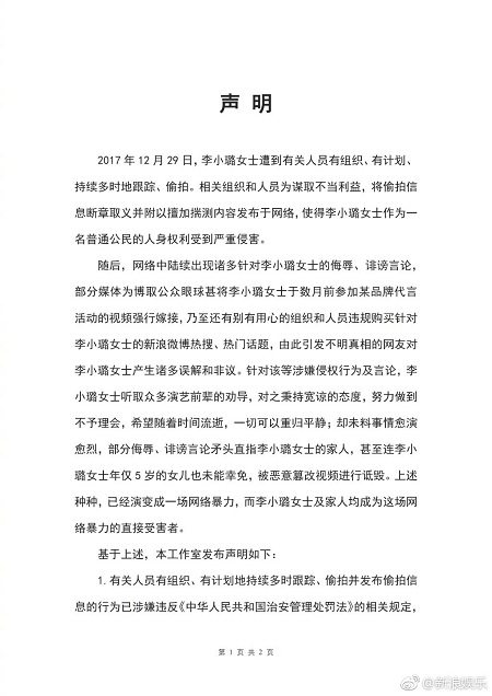 Thông qua Studio làm việc của mình, phía Lý Tiểu Lộ cho biết bản thân nữ diễn viên đã vấp phải "bạo lực mạng" khủng khiếp, ảnh hưởng tới tên tuổi và người thân nghiêm trọng. Hiện tại, phía nữ diễn viên đang thu thập bằng chứng và quyết theo đuổi vụ việc đến cùng.