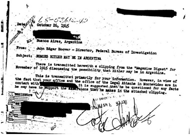 Tài liệu của FBI, trong đó có đề cập 'tin đồn rằng Hitler có thể đang ở Argentina'