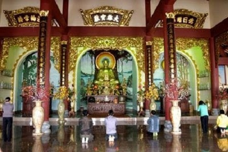 Bên trong chánh điện rộng lớn, chính giữa thờ Phật Thích Ca, bên phải là thờ Quán Thế Âm bồ tát, bên trái thờ Địa Tạng Vương bồ tát. Ba pho tượng đều được đúc bằng đồng.