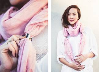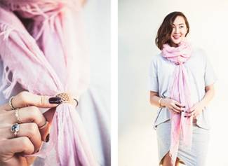 1. Quấn khăn vòng quanh cổ như bạn vẫn thường làm, sau đó luồn hai đầu thừa của khăn qua một chiếc nhẫn trơn đơn giản và kéo lên.