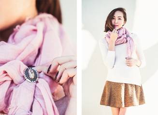 3. Quấn khăn hai vòng quanh cổ, sau đó điều chỉnh để hai đầu khăn cùng kết thúc trở về một phía. Chọn một chiếc nhẫn có mặt lớn và luồn hai đầu khăn vào. Chìa khóa để tạo nên cái nhìn thu hút chính là việc bạn kéo khăn lệch sang một bên.
