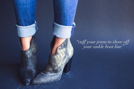 Ankle boots là loại boots cao đến cổ chân và hơi ôm. Cách diện hoàn hảo nhất với loại boots này là kết hợp với quần jeans ôm sát và xắn gấu lên, để lộ ra toàn bộ kiểu dáng và chất liệu của boots.