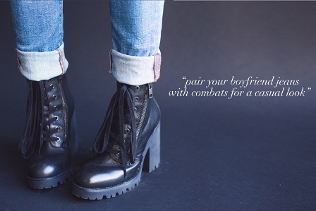 Với kiểu dáng mạnh mẽ và hầm hố mang phong cách quân đội như combat boots, loại quần thích hợp nhất để diện cùng chính là boyfriend jeans. Không ôm sát mà lại khá rộng rãi thoải mái, loại quần này được thiết kế dựa trên phom dáng quần của các bạn trai. Một chút bụi bặm, phóng khoáng và có phần “nam tính” từ chiếc quần này sẽ là sự lựa chọn hoàn hảo dành cho các bạn nữ cá tính muốn làm mới mình với combat boots.