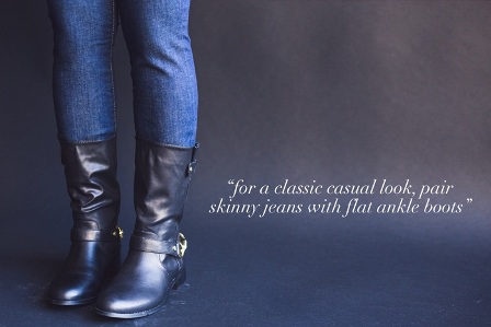 Với phần cổ cao đến bắp chân và vẫn ôm sát, flat ankle boots khác biệt so với ankle boots thông thường ở phần đế bằng chứ không phải gót cao. Quần skinny jeans ôm sát vẫn là sự lựa chọn hoàn hảo dành cho bạn khi muốn diện cùng “thành viên” tiếp theo của gia đình ankle boots này để tạo nên bộ trang phục street style đơn giản nhưng không kém phần nổi bật, cuốn hút.