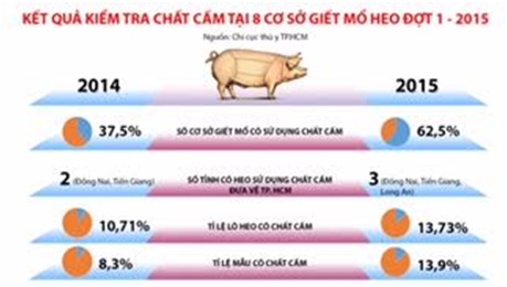 - Năm cơ sở có các lô heo dương tính với tồn dư chất cấm gồm cơ sở giết mổ Nam Phong (Q.Bình Thạnh), cơ sở giết mổ Bình Tân (Q.Bình Tân), cơ sở giết mổ An Hạ (H.Củ Chi), cơ sở giết mổ trạm 4 (Q.8) và cơ sở giết mổ Phước Kiển (H.Nhà Bè), tăng hai cơ sở so với năm 2014. Trong đó, cơ sở giết mổ Bình Tân tái phạm lần thứ 2.