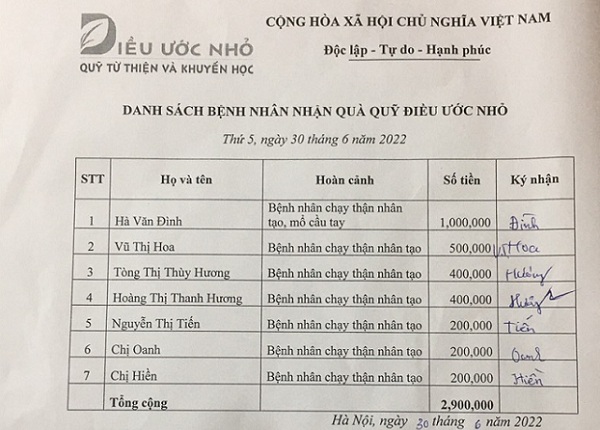 Qũy Điều ước nhỏ Kính gửi các Cô/Chú/Anh/Chị và các Bạn kế hoạch chương trình thiện nguyện cho các bệnh nhân chạy thận nhân tạo: “Trao đi là còn mãi số 20" tại xóm thận Lê Thanh Nghị -