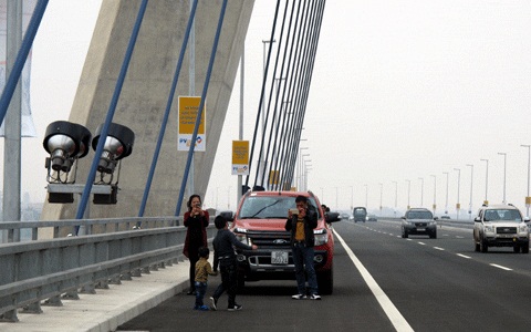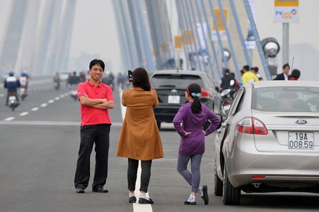 Nhiều người dân “tranh thủ” đứng chụp ảnh làm kỷ niệm trên cầu