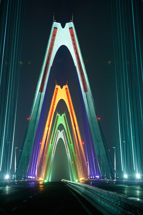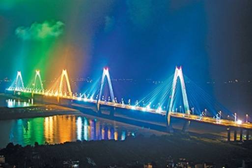 Cầu Nhật Tân tỏa sáng rực rỡ cả một khúc sông Hồng