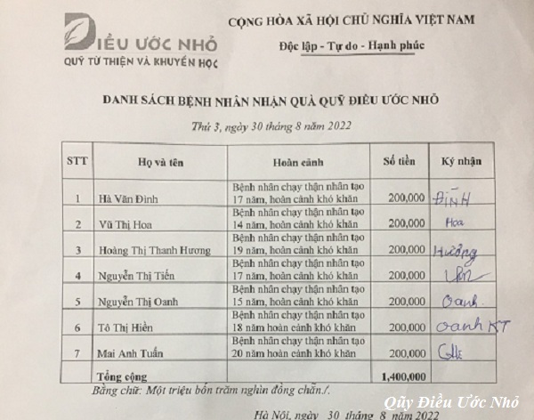 Qũy Điều ước nhỏ kính gửi các Cô/Chú/Anh/Chị và các Bạn kế hoạch chương trình trao đi là còn mãi số 22 dành cho các bệnh nhân chạy thận nhân tạo tại xóm thận Lê Thanh Nghị, thông tin cụ thể như sau: -