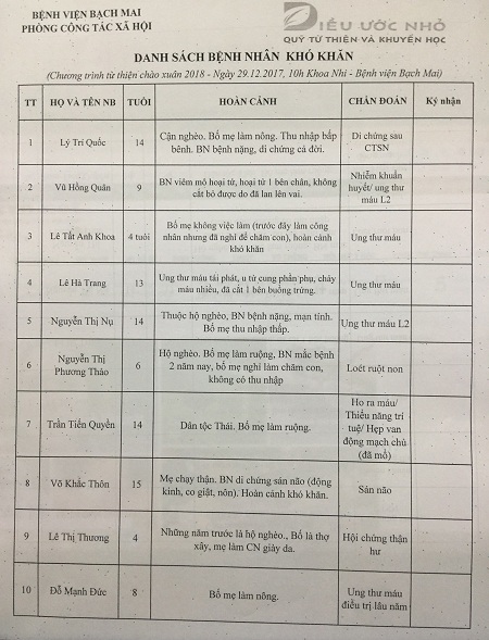 Danh sách bệnh nhi khó khăn: