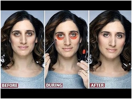 Cách làm của Deepica Mutyala không có gì phức tạp. Sau khi hoàn thiện bước nền, cô sử dụng một thỏi son đỏ và chổi để tô lên vùng da sậm màu cần khắc phục như quầng thâm mắt, rồi tiếp tục dùng kem che khuyết điểm dạng lỏng phủ lên trên, tán đều lớp kem và làm cho quầng thâm biến mất ngoạn mục.
