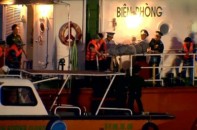 Thượng tá Trần Quang Khải được chuyển xuống cano đưa vào đất liền.