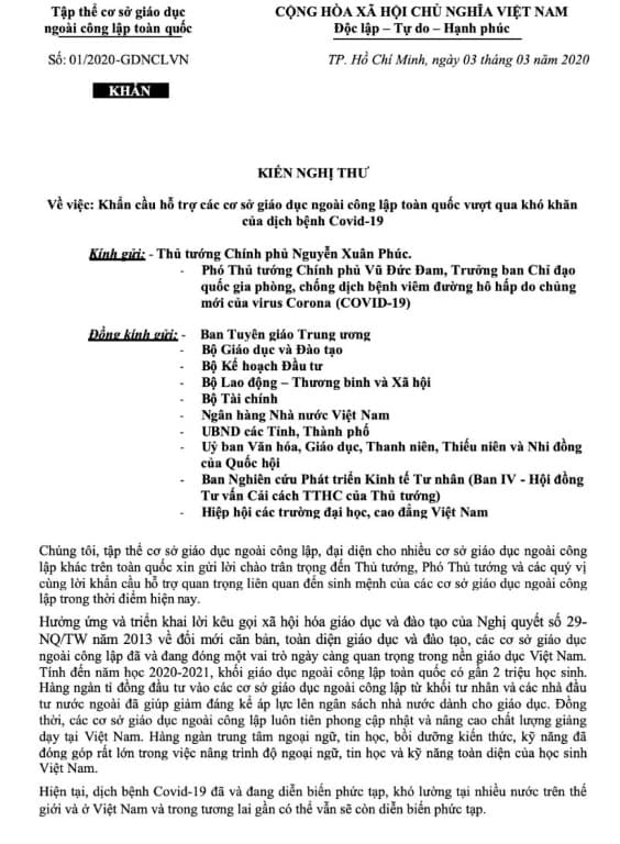 Thư kiến nghị của tập thể cơ sở giáo dục ngoài công lập.